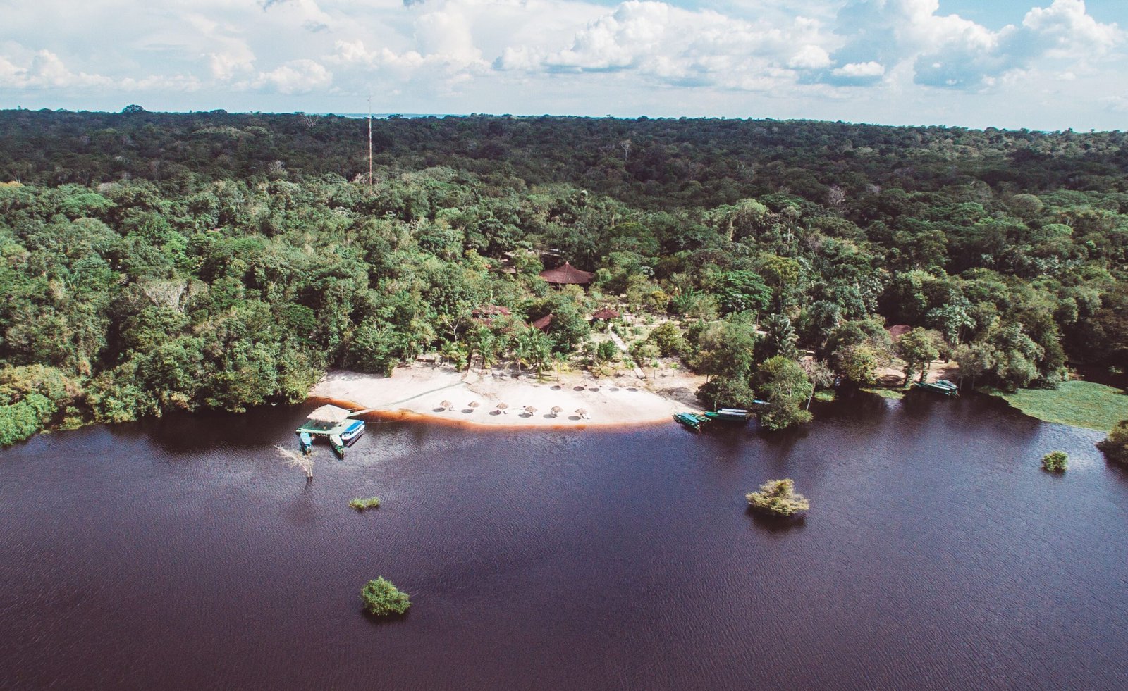 The lodge is designed in a traditional Amazonian style, with a central restaurant, bar, and a relaxing deck overlooking the river. A key highlight is the private, protected river beach, which features natural swimming pools perfect for a safe and refreshing dip in the Rio Negro’s dark, mosquito-repelling waters.